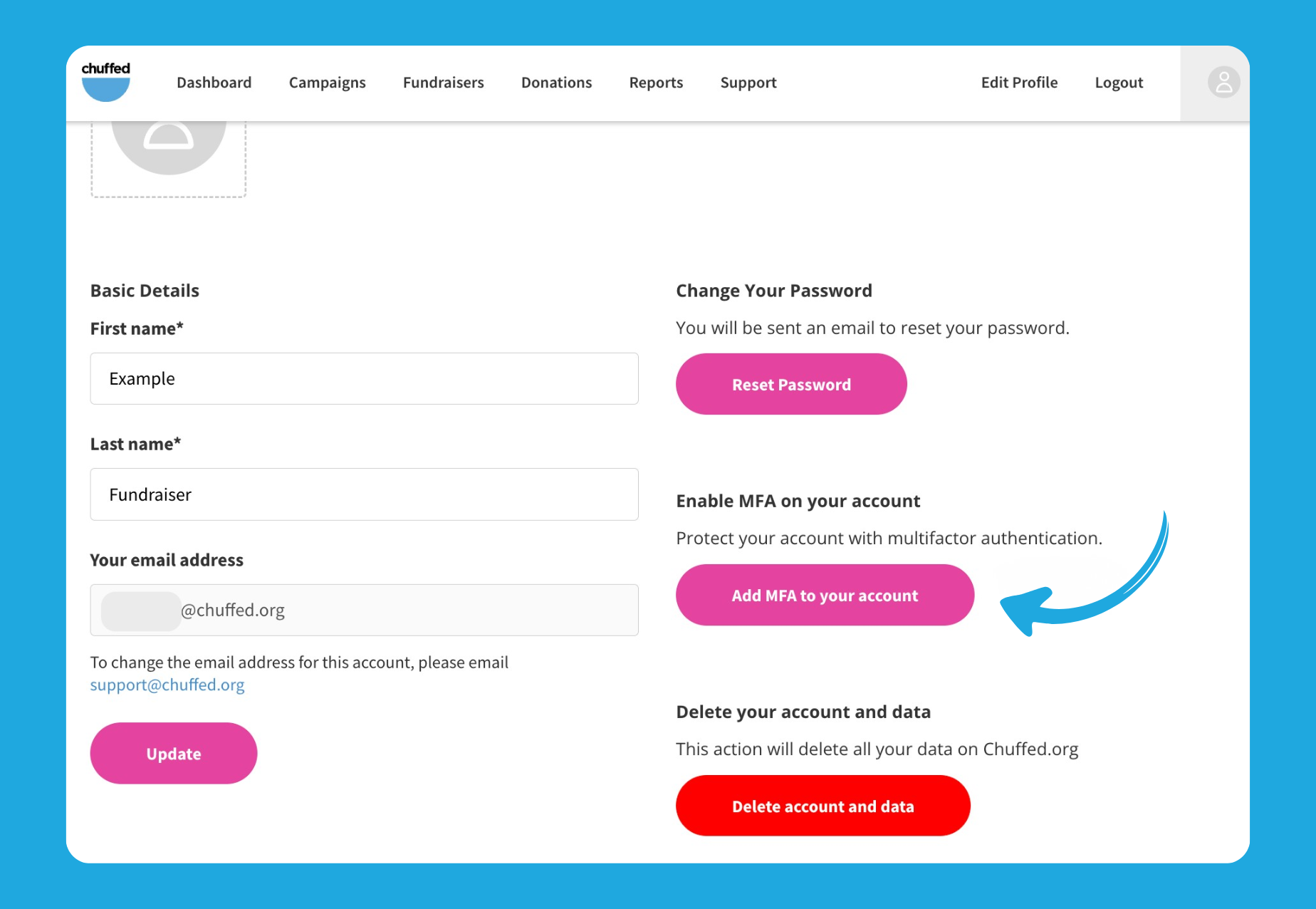 Adding MFA to your account is a precautionary security measure. If you don’t set up MFA, you will still be able to access your account and continue to manage your campaigns. From 24th February 2026, MFA will be required to access personally identifiable information (PII) within your campaign. This includes donation data in your reports and integrations.